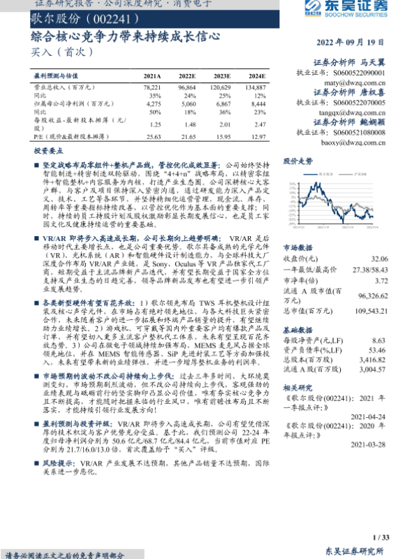 【东吴证券】【20220919】歌尔股份:综合核心竞争力带来持续成长信心-33页 行业研究