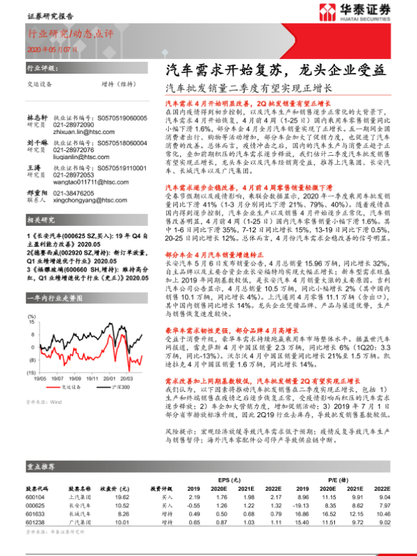 【华泰证券】【20200507】交运设备:汽车批发销量二季度有望实现正增长-汽车需求开始复苏,龙头企业受益-3页 行业研究