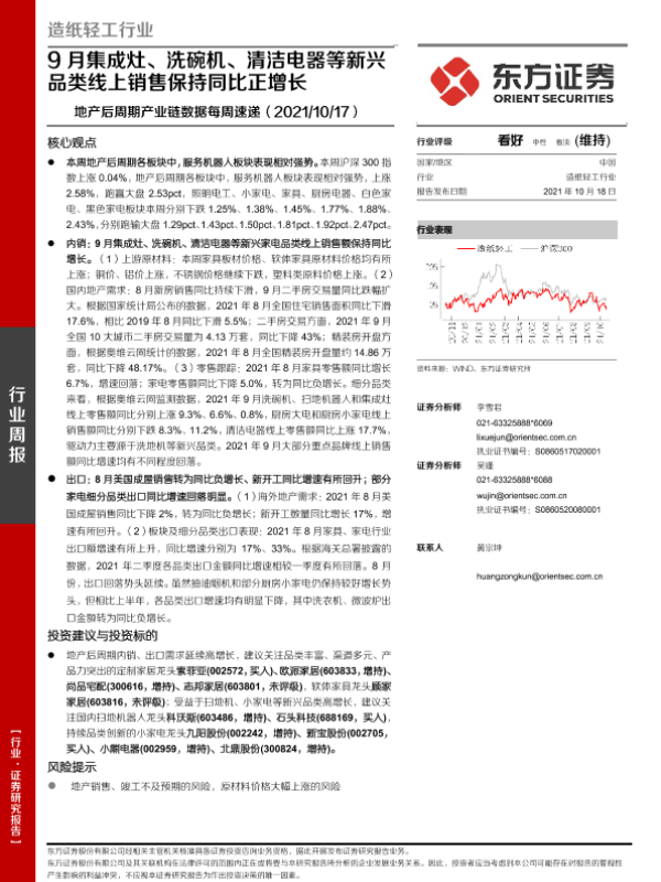 【东方证券】【20211018】20211018-东方证券-造纸轻工行业周报:地产后周期产业链数据每周速递-9月集成灶、洗碗机、清洁电器等新兴品类线上销售保持同比正增长-14页 行业研究