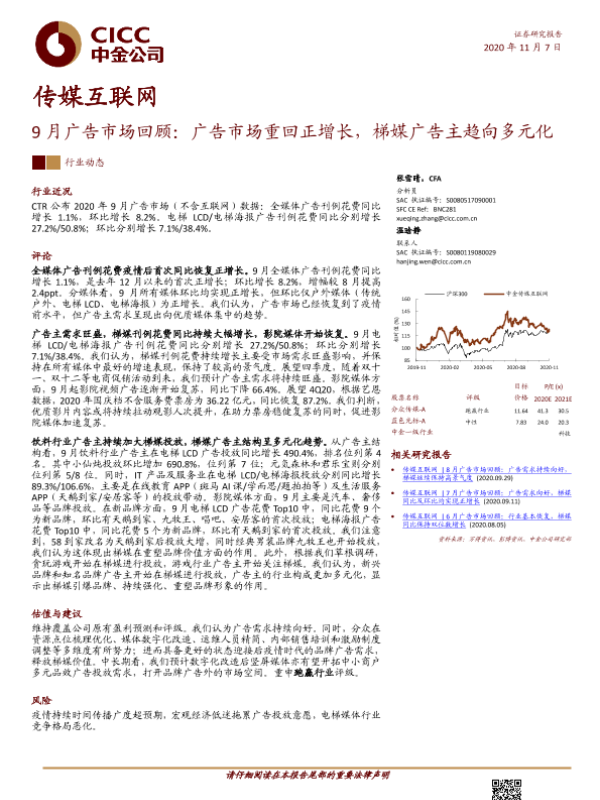 【中金公司】【20201107】9月广告市场回顾:广告市场重回正增长,梯媒广告主趋向多元化-7页 行业研究