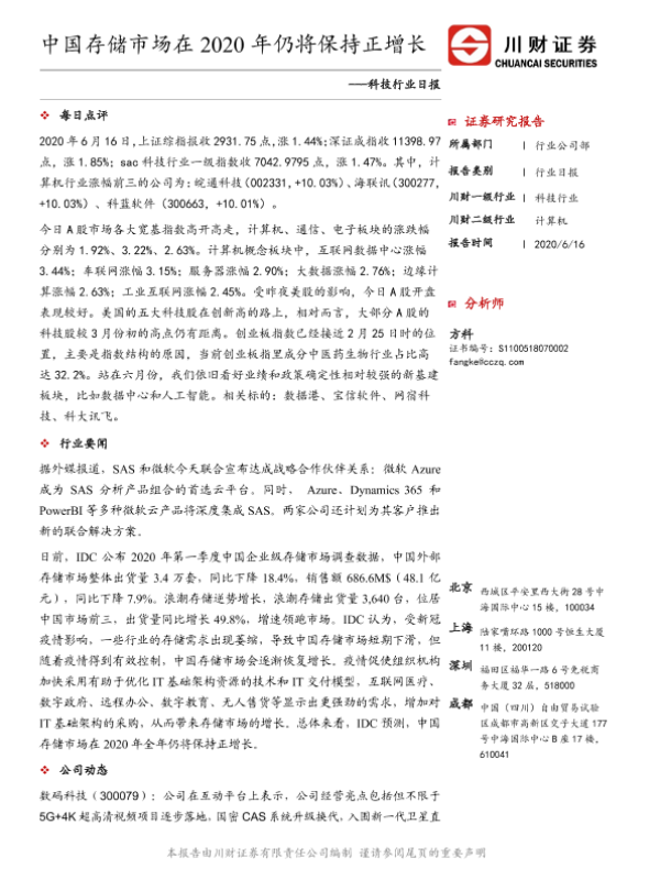 【川财证券】【20200616】科技行业日报:中国存储市场在2020年仍将保持正增长-3页 证券期货研究报告