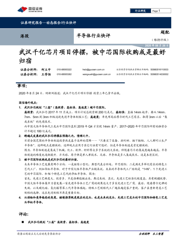 【国信证券】【20200826】20200826-国信证券-半导体行业快评:武汉千亿芯片项目停摆,被中芯国际收购或是最好归宿-12页 行业研究