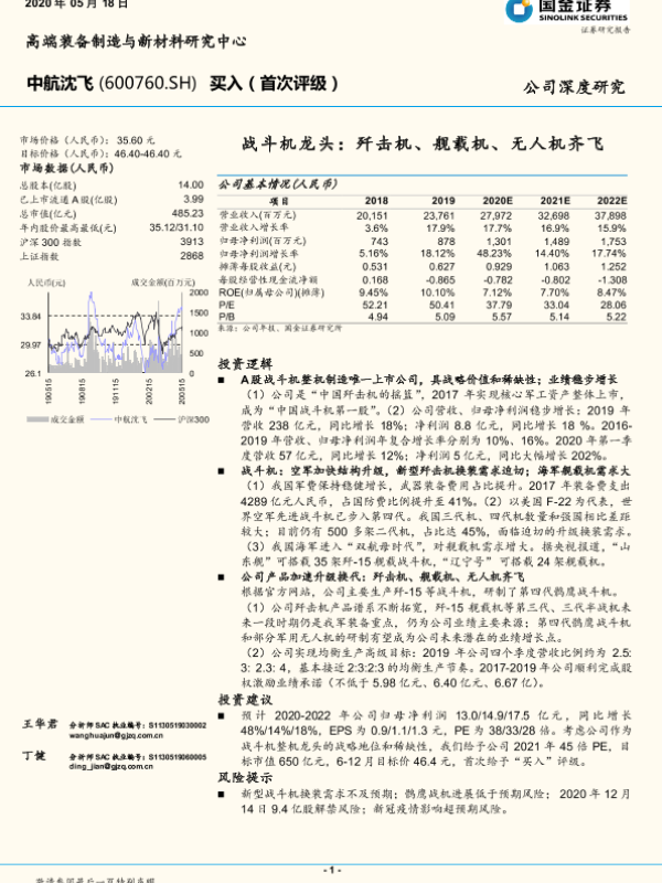 【国金证券】【20200518】20200518-国金证券-中航沈飞-600760.SH-战斗机龙头:歼击机、舰载机、无人机齐飞-23页 行业研究