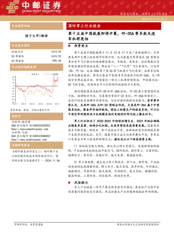 【中邮证券】【20241110】20241110-中邮证券-国防军工行业报告:第十五届中国航展即将开幕,歼-35A等多款先进军机将亮相-13页 行业研究
