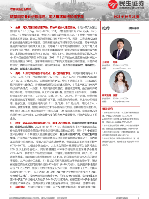 【民生证券】【20231023】20231023-民生证券-农林牧渔行业周报:转基因商业化进程提速;淘汰母猪价格加速下跌-15页 行业研究