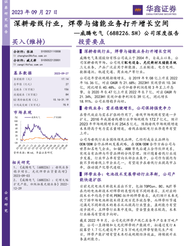 【华鑫证券】【20230927】深耕母线行业,焊带与储能业务打开增长空间—威腾电气(688226.SH)公司深度报告-28页 行业研究