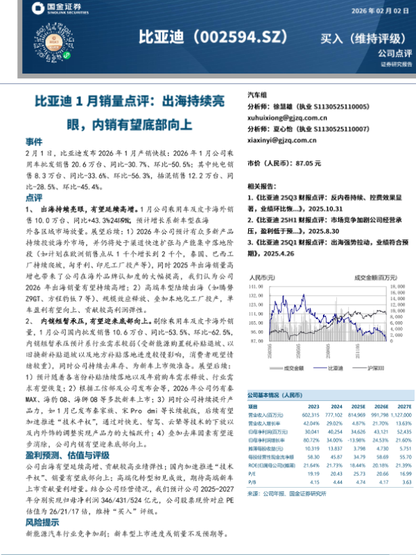 【国金证券】【202602】比亚迪1月销量点评:出海持续亮眼,内销有望底部向上-4页 证券期货研究报告