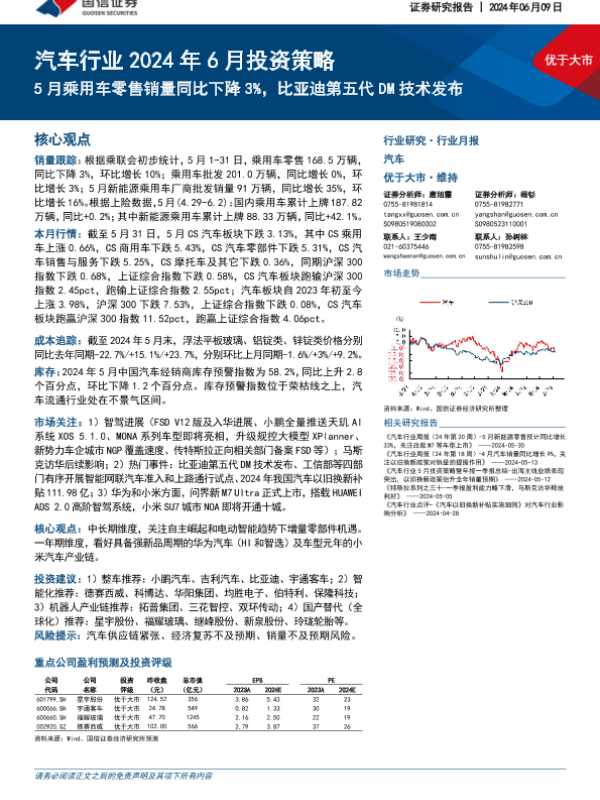 【国信证券】【20240609】汽车行业2024年6月投资策略:5月乘用车零售销量同比下降3%,比亚迪第五代DM技术发布-35页 行业研究
