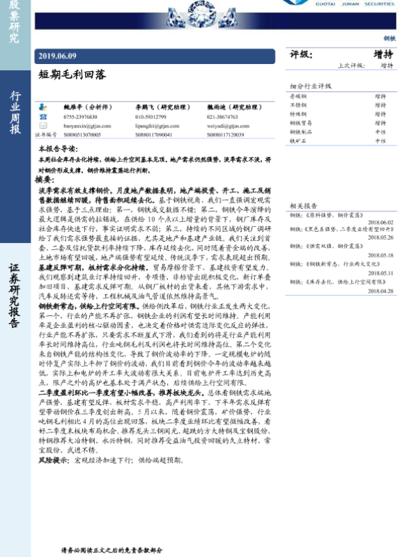 【国泰君安证券】【20190609】20190609-国泰君安-钢铁行业周报:短期毛利回落-20页 行业研究