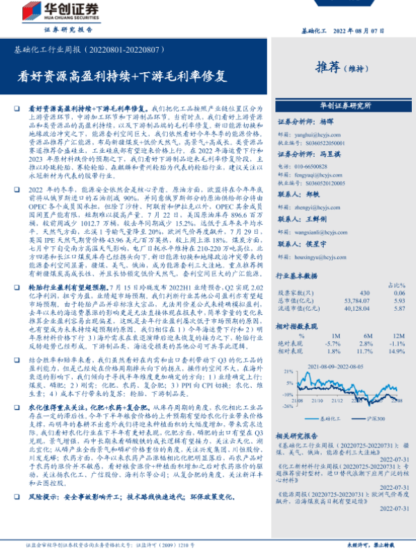 【华创证券】【20220807】20220807-华创证券-基础化工行业周报:看好资源高盈利持续+下游毛利率修复-58页 行业研究