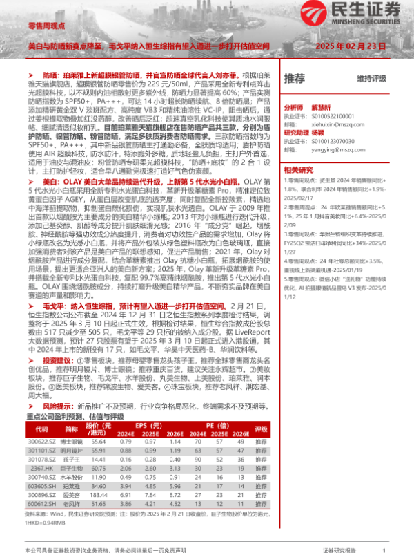 【民生证券】【20250223】美白与防晒新赛点降至,毛戈平纳入恒生综指有望入通进一步打开估值空间-18页 行业研究