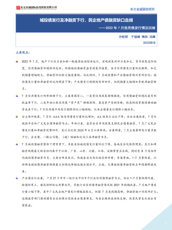 【东方金诚】【20220818】2022年7月信用债发行情况回顾:城投债发行及净融资下行,民企地产债融资缺口走阔-15页 行业研究