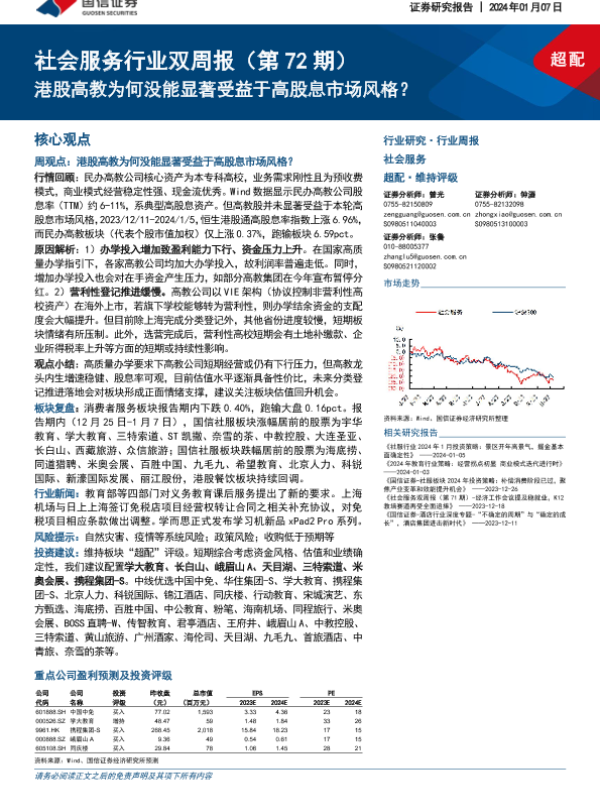 【国信证券】【20240107】社会服务行业双周报:港股高教为何没能显著受益于高股息市场风格?-13页 行业研究