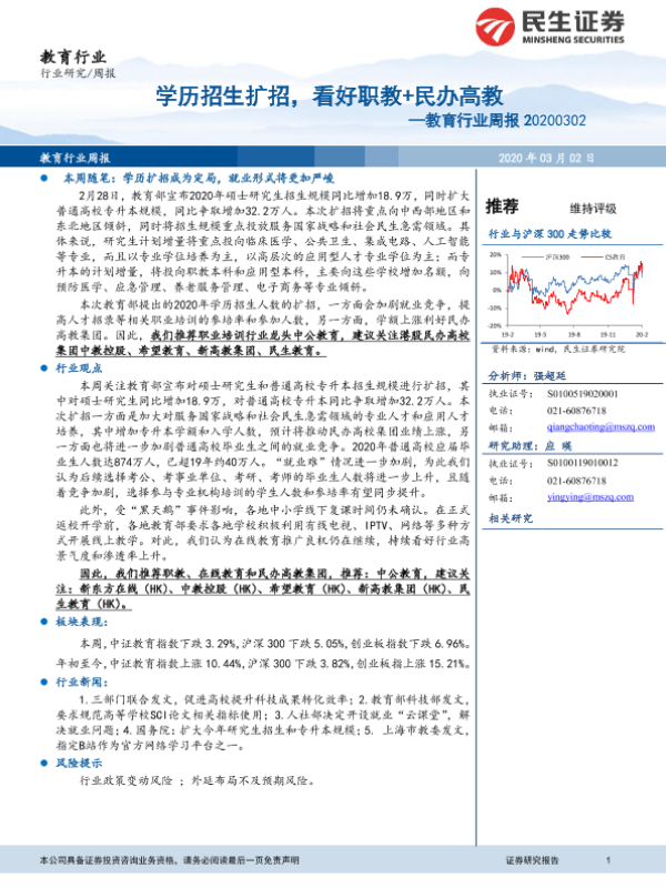 【民生证券】【20200302】20200302-民生证券-教育行业周报:学历招生扩招,看好职教+民办高教-14页 行业研究