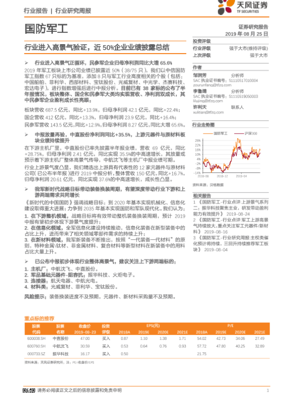 【天风证券】【20190825】国防军工行业研究周报:行业进入高景气验证,近50%企业业绩披露总结-3页 行业研究