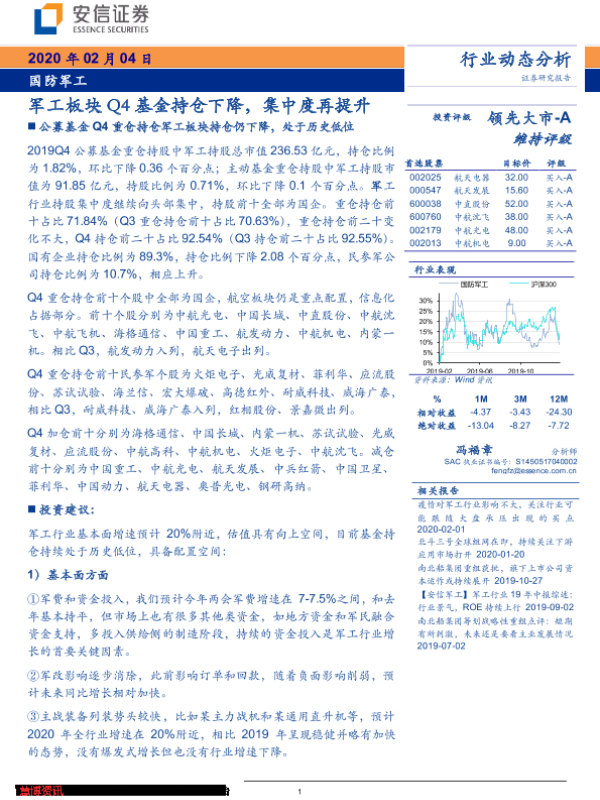 【安信证券】【20200204】国防军工:军工板块Q4基金持仓下降,集中度再提升-9页 行业研究