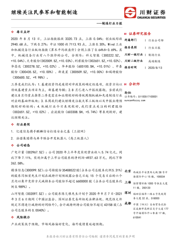 【川财证券】【20200813】制造行业日报:继续关注民参军和智能制造-2页 证券期货研究报告