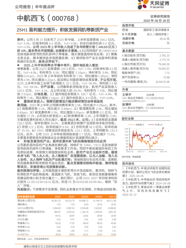 【天风证券】【20250828】中航西飞-25H1盈利能力提升;积极发展民机等新质产业-3页 证券期货研究报告