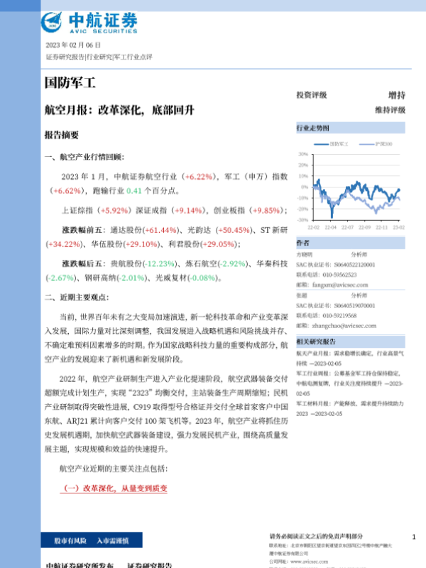 【中航证券】【20230206】国防军工行业航空月报:改革深化,底部回升-20页 行业研究
