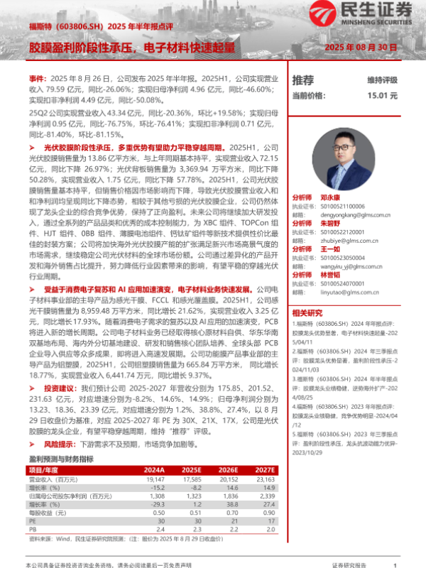 【民生证券】【20250830】福斯特-2025年半年报点评_胶膜盈利阶段性承压_电子材料快速起量-3页 证券期货研究报告