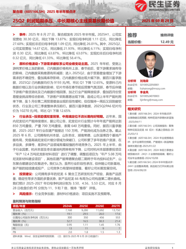 【民生证券】【20250828】聚合顺-25Q2利润短期承压,中长期核心主线奠基长期价值-3页 证券期货研究报告