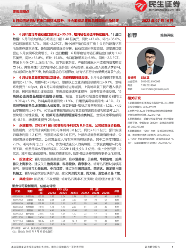 【民生证券】【20220716】零售周观点:6月印度培育钻石出口额环比提升,社会消费品零售总额同比由负转正-18页 行业研究