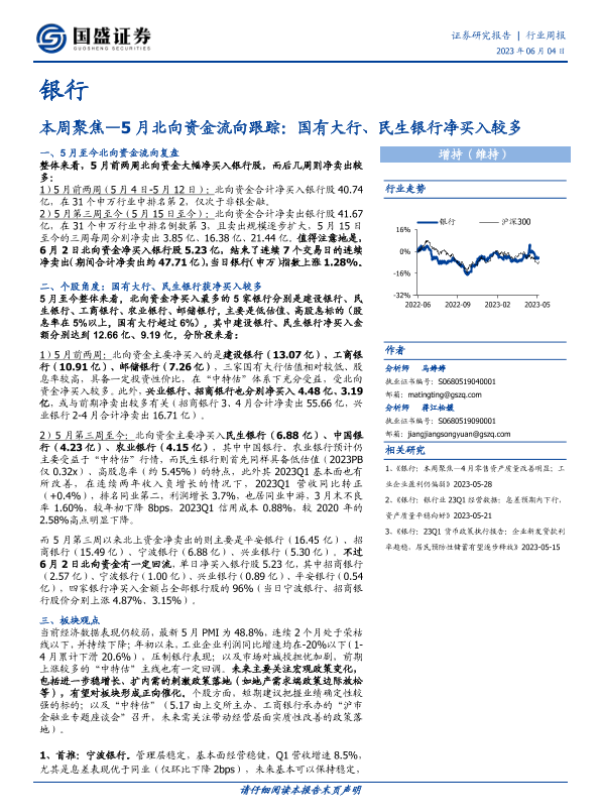 【国盛证券】【20230604】本周聚焦-5月北向资金流向跟踪:国有大行、民生银行净买入较多-12页 行业研究