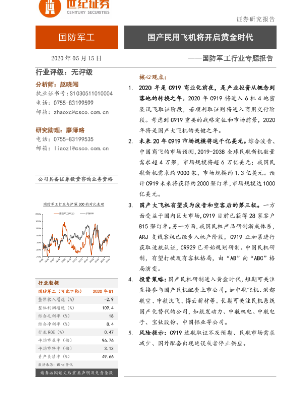 【世纪证券】【20200515】国防军工行业专题报告:国产民用飞机将开启黄金时代-20页 行业研究