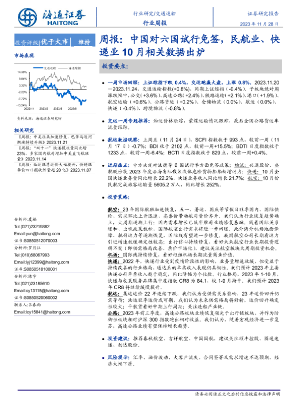 【海通证券】【20231128】交通运输周报:中国对六国试行免签,民航业、快递业10月相关数据出炉-11页 行业研究