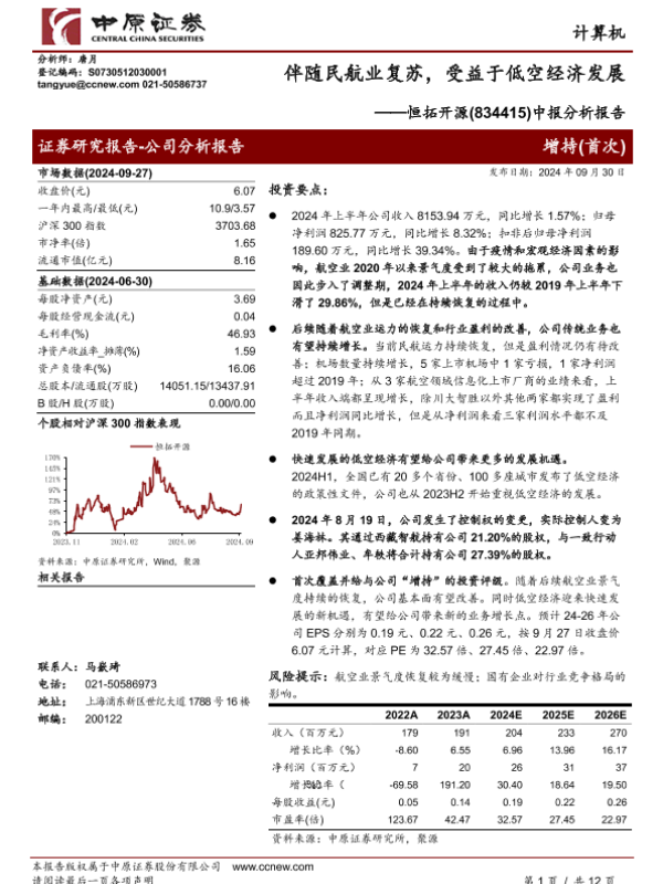 【中原证券】【20240930】恒拓开源(834415)中报分析报告:伴随民航业复苏,受益于低空经济发展-12页 行业研究