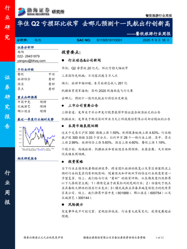 【渤海证券】【20200916】餐饮旅游行业周报:华住Q2亏损环比收窄 去哪儿预测十一民航出行创新高-12页 行业研究