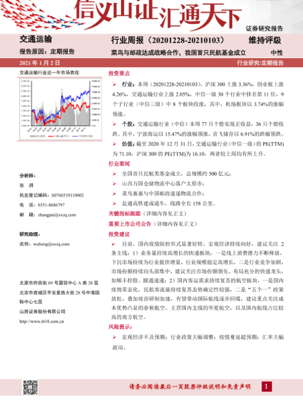 【山西证券】【20210102】交通运输行业周报:菜鸟与邮政达成战略合作,我国首只民航基金成立-14页 行业研究