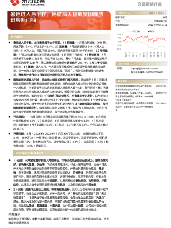 【东方证券】【20220807】交通运输行业周报:暑运进入后半程,民航局大幅放宽国际航班熔断门槛-16页 行业研究