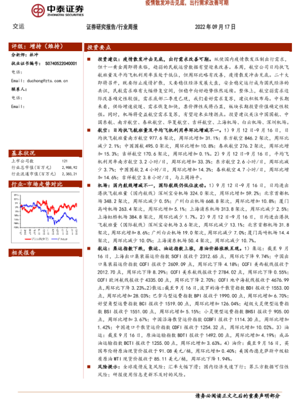 【中泰证券】【20220917】交运行业周报:疫情散发冲击见底,出行需求改善可期-34页 行业研究