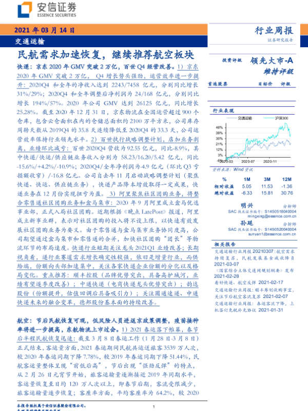 【安信证券】【20210314】交通运输行业周报:民航需求加速恢复,继续推荐航空板块-18页 行业研究