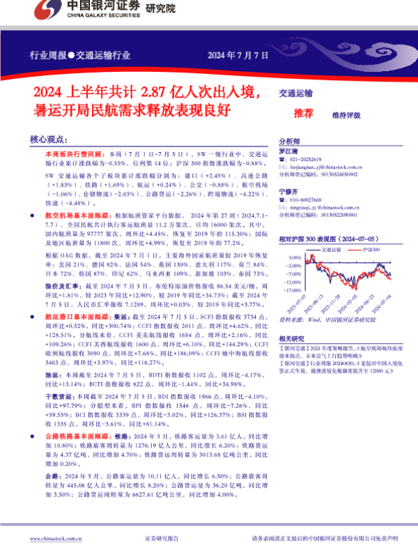 【银河证券】【20240707】2024上半年共计2.87亿人次出入境,暑运开局民航需求释放表现良好-20页 行业研究
