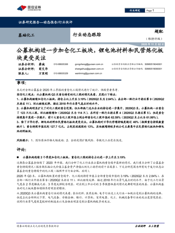 【国信证券】【20201102】基础化工行业动态跟踪:公募机构进一步加仓化工板块,锂电池材料和民营炼化板块更受关注-8页 行业研究
