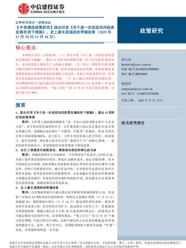 【中信建投证券】【202511】【政策研究】国办印发《关于进一步促进民间投资发展的若干措施》,史上最长美国政府停摆结束(2025年11月10日-11月16日)-13页 政策文件