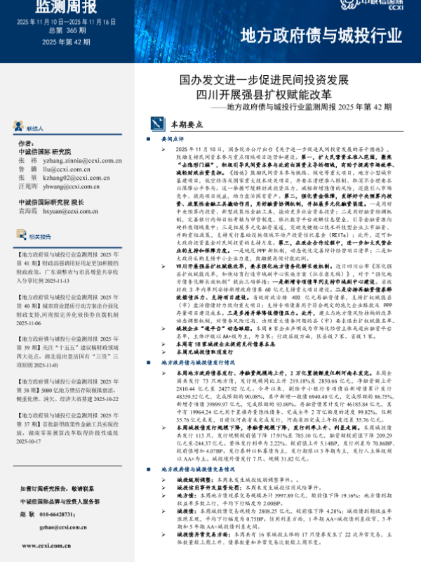 【中诚信国际】【202511】地方政府债与城投行业监测周报2025年第42期 国办发文进一步促进民间投资发展,四川开展强县扩权赋能改革-22页 行业研究