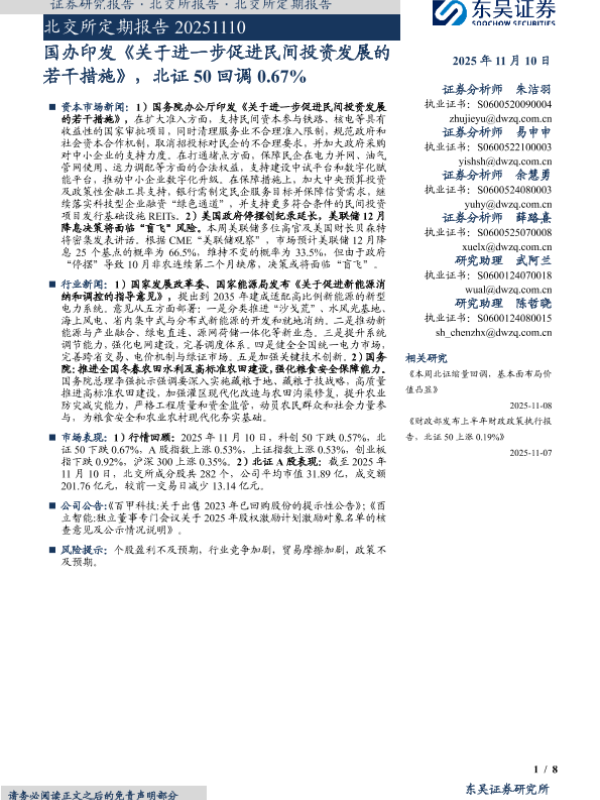 【东吴证券】【202511】国办印发《关于进一步促进民间投资发展的若干措施》,北证50回调0.67%-8页 证券期货研究报告