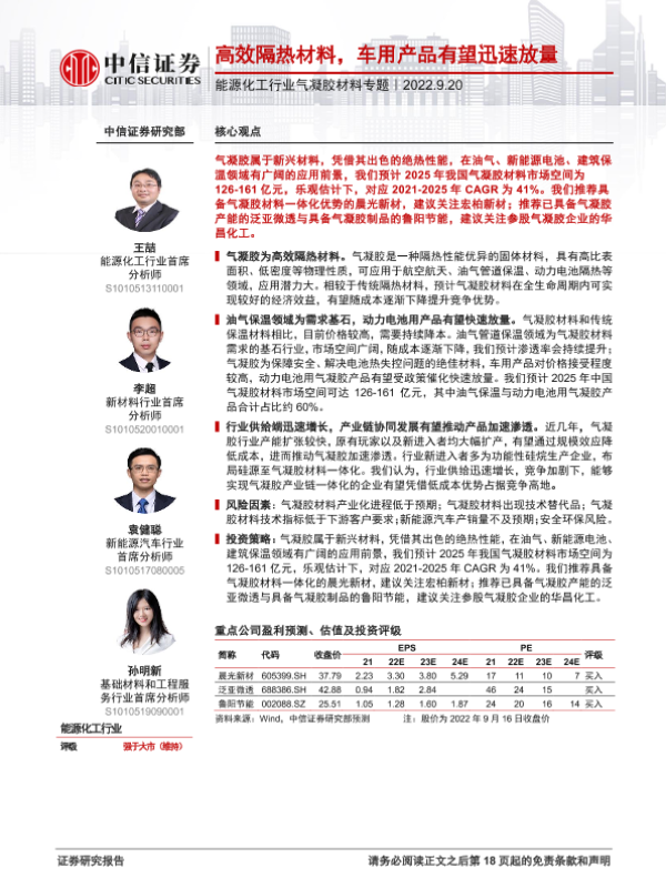 【中信证券】【20220920】能源化工行业气凝胶材料专题:高效隔热材料,车用产品有望迅速放量-19页 行业研究