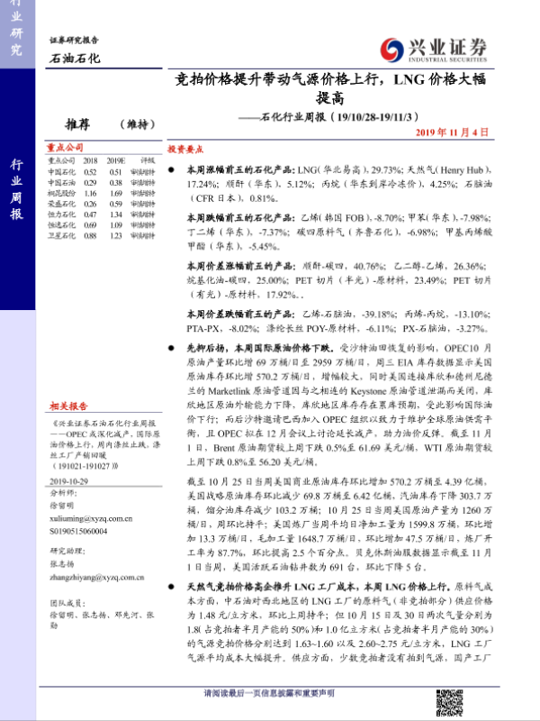 【兴业证券】【20191104】20191104-兴业证券-石化行业周报:竞拍价格提升带动气源价格上行,LNG价格大幅提高-13页 行业研究