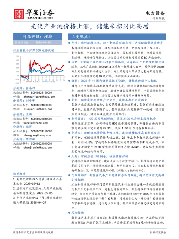 【华安证券】【20250720】电力设备行业周报:光伏产业链价格上涨,储能采招同比高增-22页 行业研究