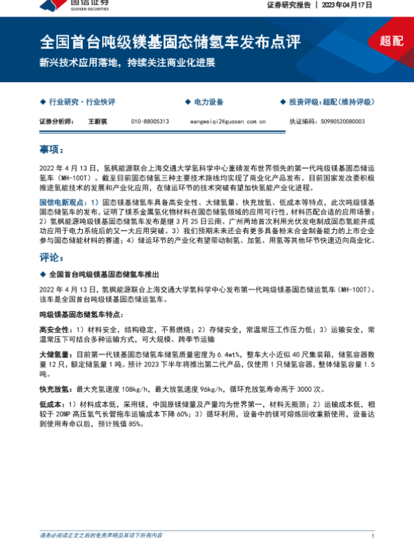 【国信证券】【20230417】全国首台吨级镁基固态储氢车发布点评-新兴技术应用落地,持续关注商业化进展-10页 行业研究