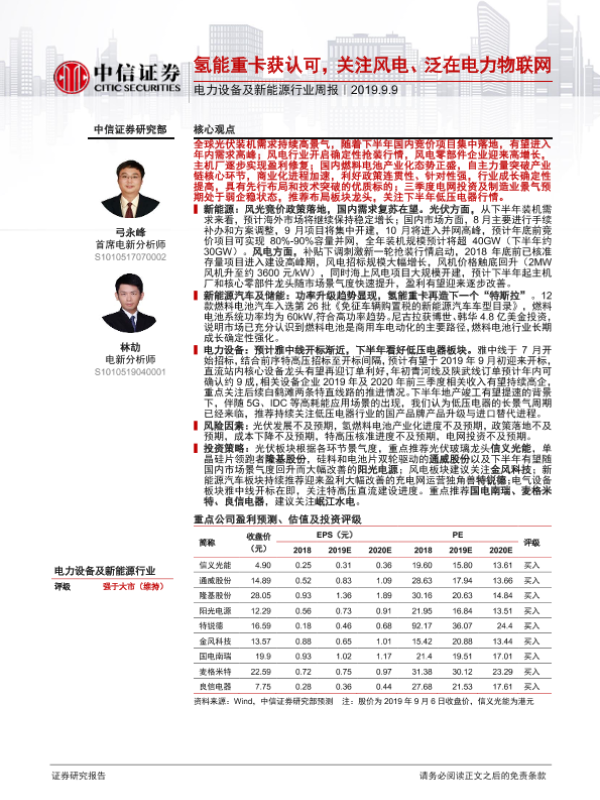 【中信证券】【20190909】电力设备及新能源行业周报:氢能重卡获认可,关注风电、泛在电力物联网-15页 行业研究