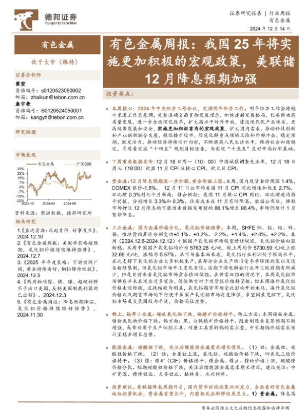 【德邦证券】【20241214】20241214-德邦证券-有色金属行业周报:我国25年将实施更加积极的宏观政策,美联储12月降息预期加强-25页 行业研究