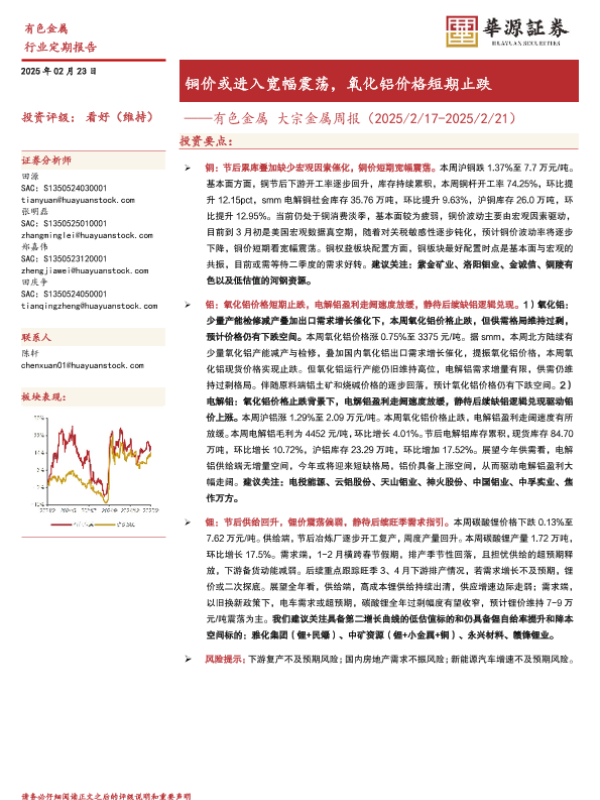【华源证券】【20250223】有色金属 大宗金属周报:铜价或进入宽幅震荡,氧化铝价格短期止跌-16页 行业研究