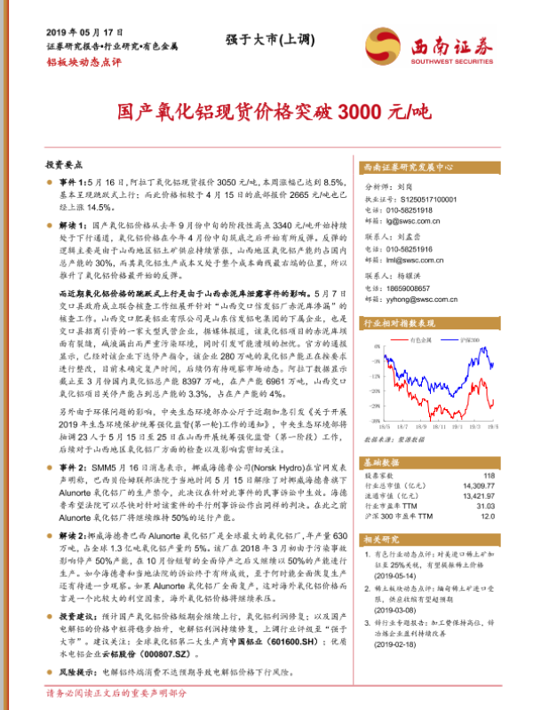 【西南证券】【20190517】铝板块动态点评:国产氧化铝现货价格突破3000元/吨-3页 行业研究