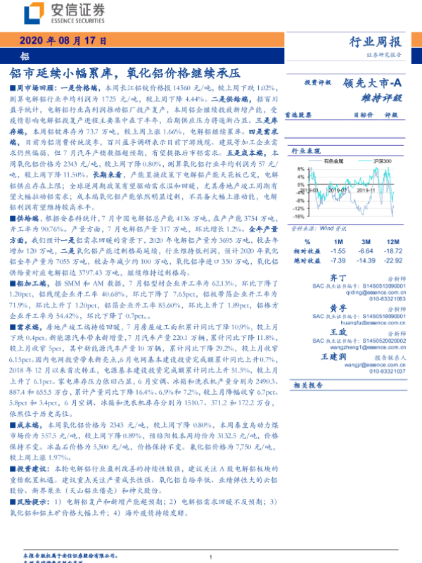 【安信证券】【20200817】铝行业周报:铝市延续小幅累库,氧化铝价格继续承压-23页 行业研究