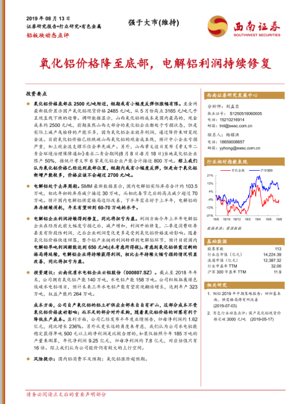 【西南证券】【20190813】铝板块动态点评:氧化铝价格降至底部,电解铝利润持续修复-3页 行业研究